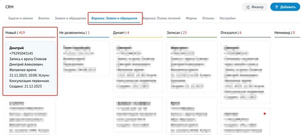 Обрадуйте своих маркетологов, теперь Лиды и заявки из форм на сайте будут автоматически попадать в Dentist Plus CRM: Заявки и обращения.