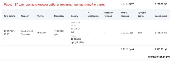 ️При этом когда мы рассчитываем зарплату доктора и вычитаем работу техника, то при частичной оплаты от пациента, мы также частично вычитаем сумму, которую оплатили технику.