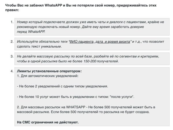Пренебрежение этих правил, приведёт к блокировке номера со стороны мессенджера!