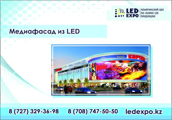 ↪ Led Expo — светодиодная продукция Казахстан Медиафасад из LED – отлично вписывается в современный городской пейзаж, служит для передачи любого вида информации и никак не влияет на прохождение в помещение дневного света.