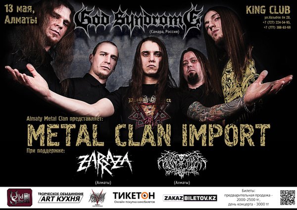 сцене King Club. БРОНИРОВАНИЕ СТОЛИКОВ GOD SYNDROME выступят при поддержке групп Алматы: ZARRAZA — slamming thrash metal () СИМФОНИЯ УЖАСА — symphonic black metal () БИЛЕТЫ: 2000 тг — предварительная продажа до 30 апреля 2500 тг — предварительная продажа с 1 по 12 мая 3000 тг — в день концерта ГДЕ КУПИТЬ? Ticketon — ZakazBiletov — репетиционная база INPUT (Александр, У организаторов: Николай — Константин -