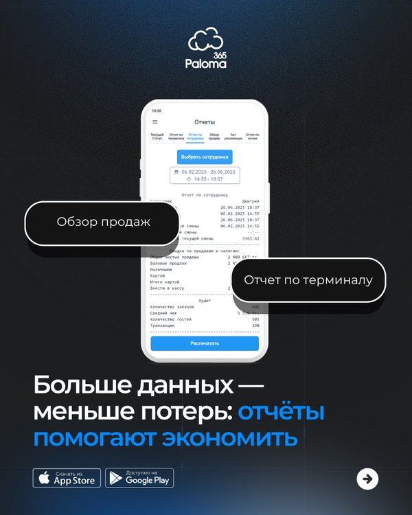 Узнайте, как Paloma365 превращает хаос данных в управляемый бизнес. Получите встроенную аналитику для точного контроля продаж, склада и персонала. Начните принимать стратегические решения на основе данных, чтобы выстраивать финансовую устойчивость и гарантированный рост. Paloma365 — ваш инструмент, который превращает цифры в уверенность и стабильную прибыль. Наш колл-центр: без выходных с 10:00 до 19:00