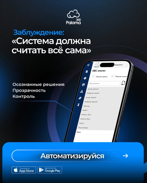 Paloma365 — точный учётингредиентов, автоматический расчёт расходов и контроль себестоимости. Видите каждое списание и управляете кухней на фактах, а не догадках. Наш колл-центр: без выходных с 10:00 до 19:00