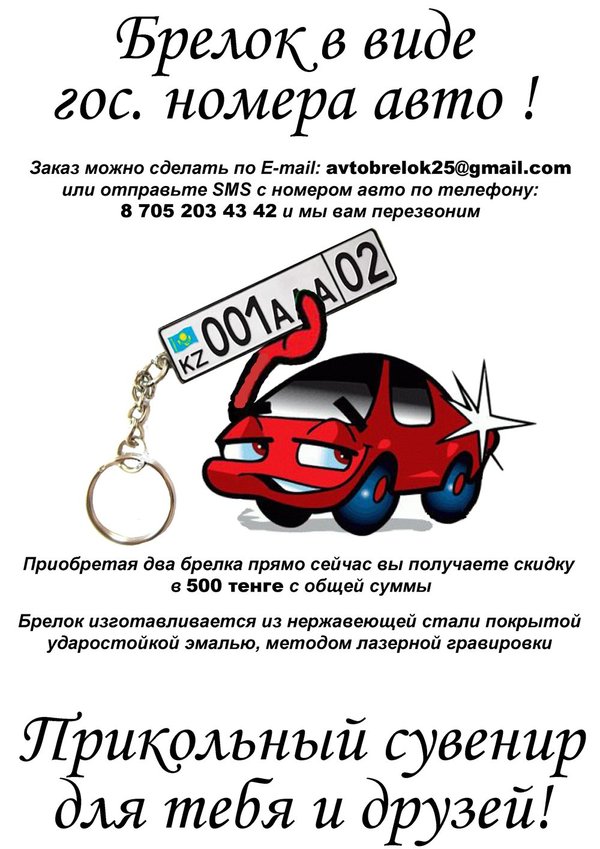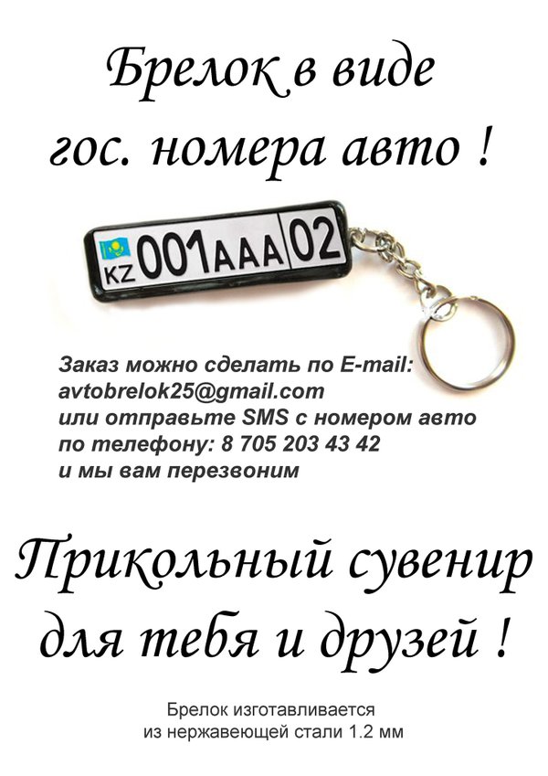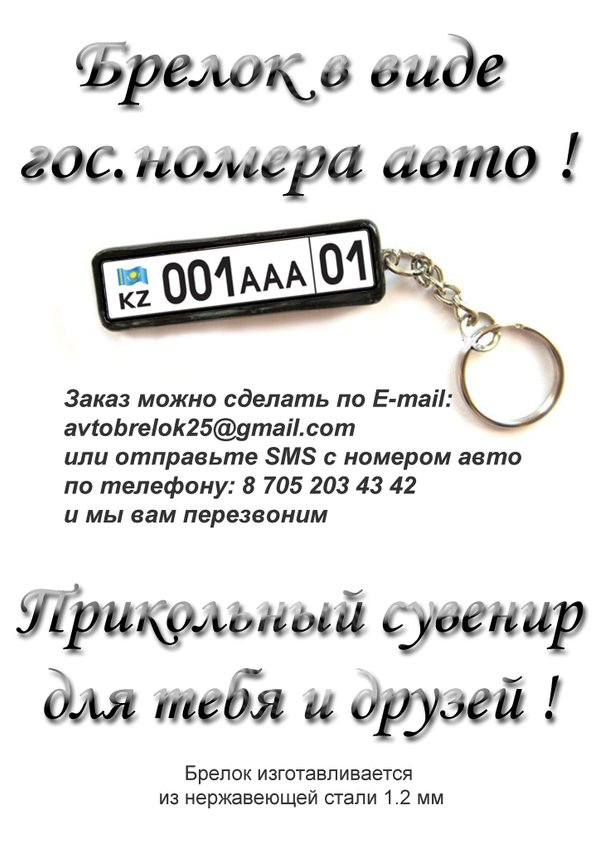 Привет Всем!!! В Алматы уже в продаже Брелок в виде гос. номер твоего авто. заказать можно по телефону или на почту avtobrelok25@gmail.com
