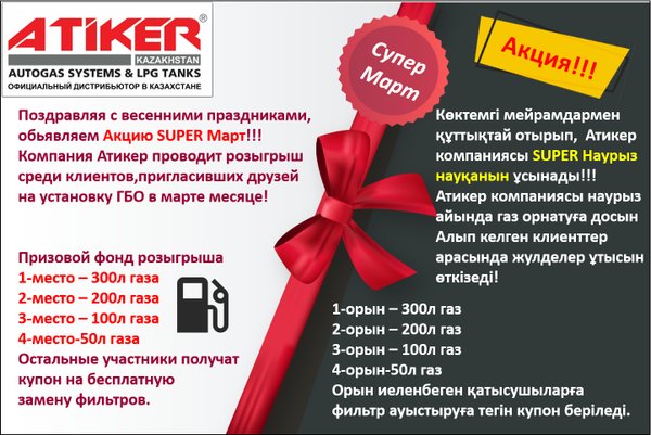 Поздравляя с весенними праздниками, обьявляем Акцию SUPER Март!!! Компания Атикер проводит розыгрыш среди клиентов, пригласивших друзей на установку ГБО в марте месяце! Призовой фонд розыгрыша 1-место – 300л газа 2-место – 200л газа 3-место – 100л газа 4-место-50л газа Остальные участники получат купон на бесплатную замену фильтров. Көктемгі мейрамдармен құттықтай отырып, Атикер компаниясы SUPER Наурыз науқанын ұсынады!!! Атикер компаниясы наурыз айында газ орнатуға досын Алып келген клиенттер арасында жулделер ұтысын өткізеді! 1-орын – 300л га… — Читать дальше