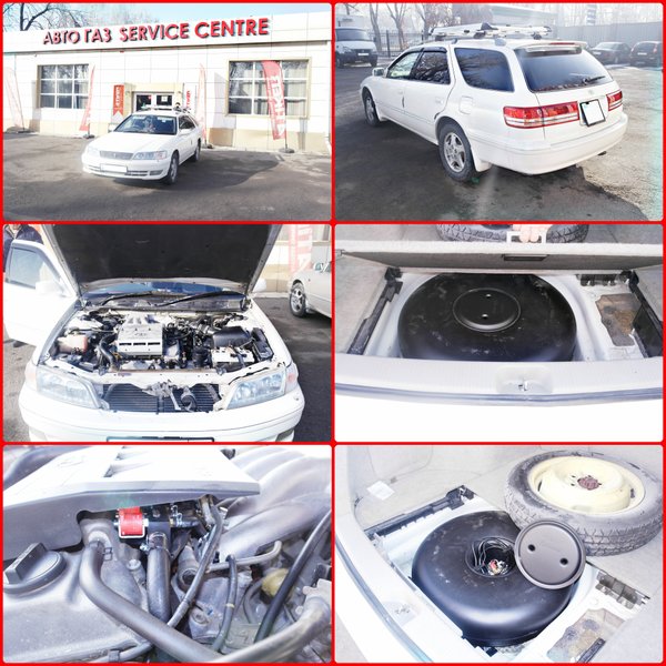 Установка на ГБО на Toyota Mark II. Год выпуска — 1998. Объем — 2490 Автовладелец выбрал баллон вместо запаски (тороидальный). Объем баллона 57 литров. Полная заправка будет составлять 45—46 литров газа. Цены и какие объемы баллонов подойдут на Ваш автомобиль можно узнать позвонив по телефонам: ; ; ; .