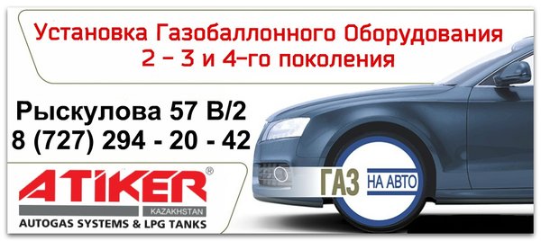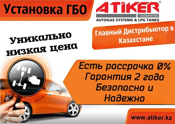 Мы знаем как спасти Ваш кошелек! ATIKER предлагает реальную экономию и окупаемость ваших затрат! Установка Газобаллонного Оборудования значительно снизит Ваши расходы на топливо! Выгодные условия кредитования и РАССРОЧКИ через Банк Home Credit и Евразийский Банк! Рассрочка до 3- месяцев! Без первоначального взноса! Телефоны: ; ; ; . Адрес: 1) Рыскулова 57 В/2 (Головной офис). 2) Хан Шатыр 287 (пересечение Рыскулова — Момышулы. Вторая точка)