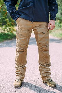 ополнительную защиту, вставляемую внутрь. Задний карман брюк при необходимости может быть увеличен вдвое. Рядом с задним левым карманом находится MOLLE интерфейс, который позволяет использовать подсумки, совместимые с данной системой крепления. Рядом с задним правым карманом находится малый карман для GPS, авторучек и маркеров. На задней части бедер размещены два больших грузовых кармана. На нижней части брюк с правой стороны имеется малый карман под жгут, ключи и т.д. Брюки имеют небольшой вес за счет легкой и дышащей ткани, которая не выстирывается и не выцветает даже после очень долгого срока эксплуатации. СОСТАВ: ткань РИПСТОП: 65% полиэстер, 35% хлопок; усиление из нейлона 600D