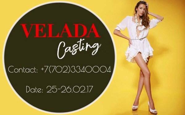 Velada Models (24.02.2017): Кастинг, г.Алматы! В эту субботу и воскресенье, 25—26 февраля, 2017 года пройдёт отбор действующих моделей в базу Velada Models, а так же отбор учеников в новую группу в школу моделей. Девушки: Рост от 173. Парни: рост от 183, (С собой сменную обувь!) Адрес: Сатпаева 22б, уг.ул Сейфуллина Время: 16:00 до 18:00 Все вопросы по номеру: WhatsApp