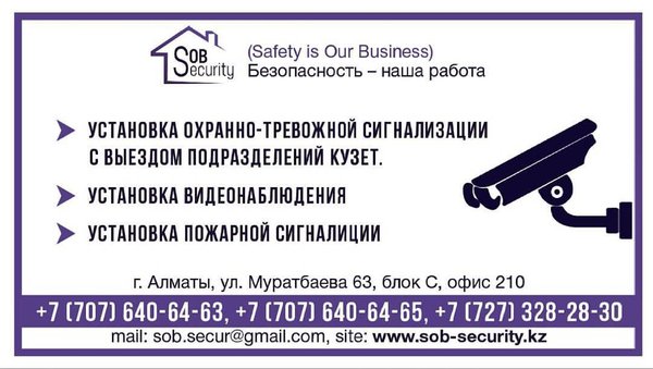 Всем известна поговорка «На бога надейся, а сам не плошай» охранная компания SOB-Security предлагает свои услуги по установки и наладки — охранной, тревожной и пожарной сигнализаций с выездом вооруженных групп Күзет а так же, установка видео наблюдения. Защитите себя и своих близких. Безопасность — наша работа