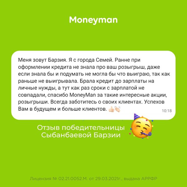 участия в акции необходимо оформить микрокредит на сайте moneyman.kz с 10 по 28 февраля на любую сумму! ️ В первый день весны (01.03.2022) мы подведем итоги в прямом эфире и определим 5 клиентов, кому не нужно будет возвращать деньги. Всем удачи!