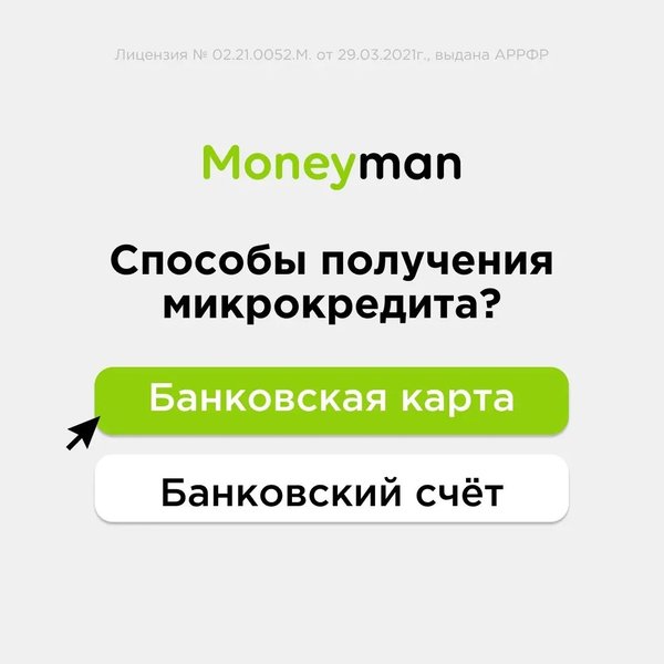 Как получить микрокредит? Есть два постоянных способа. Рассказываем каких: 1. Банковская карта — простой и доступный способ, ведь банковская карта есть практически у всех. Кстати, карту можно привязать к приложению, что здорово экономит твоё время 2. Банковский счет — если под рукой нет банковской карты, ты всегда можешь использовать IBAN счёт. Более подробную информацию можешь получить на нашем сайте Moneyman.kz в разделе “ Как получить”
