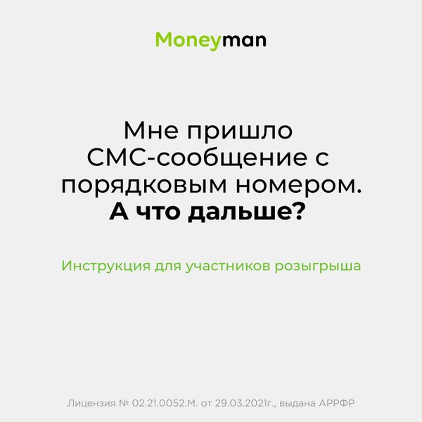 Ты когда-нибудь выигрывал деньги? Мы раздаем миллион! Пора его забрать! Просто возьми микрокредит на нашем сайте с 3 по 31 июля 2023 года, и ты автоматически станешь участником розыгрыша. 5 августа в прямом эфире мы подведем итоги, где раздадим миллион следующим образом: 1 место: 500 000 тенге; 2 место: 250 000 тенге; 3 место: 150 000 тенге; 4 место: 50 000 тенге; 5 место: 50 000 тенге. Ну все, удачи! Напоминаем, что оформить микрокредит можно на сайте moneyman.kz или в приложении Moneyman (PlayMarket). Оставь коммент, если будешь участвовать