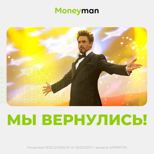 Привет! Легендарный Moneyman вернулся в ВКонтакте Будем здесь как и раньше делится промокодами-скидками, конкурсами и полезной информацией по оформлению/погашению. Кстати, пока нас не было, мы стали выдавать до 172 000 тенге! Все так же быстро! Проверяй на сайте moneyman.kz