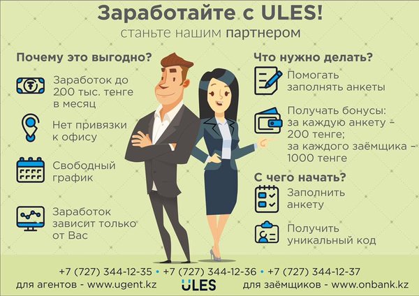Мы запустили партнерскую программу! Если у вас есть шустрые, коммуникабельные и интересные знакомые/друзья/родственники, а может это вы сами, то присоединяйтесь к Ules! Нужно только пройти легкую регистрацию и получить уникальный код, чтобы стать нашим партнером. Используя этот код и помогая заполнять анкеты можно получать бонусы за каждого привлеченного клиента до 1200 тенге. Подробности на