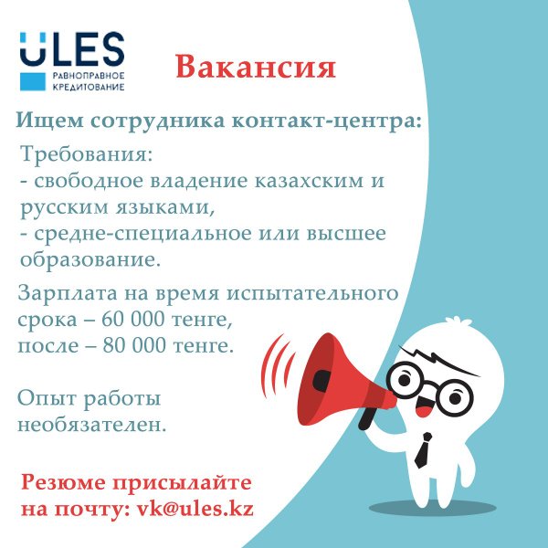 до 15.00. Опыт работы необязателен. Требования: свободное владение казахским и русским языками, средне-специальное или высшее образование. Резюме присылайте на почту: vk@ules.kz