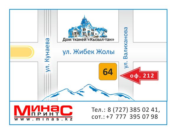 МИНАС принт (15.10.2015): Дорогие друзья! Спешим сообщить Вам, что типография «МИНАС принт» переехала в новый офис! Будем рады видеть вас по новому адресу: ул. Жибек Жолы, 64 (уг. ул. Валиханова), офис 212