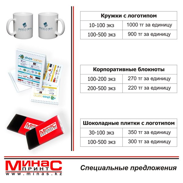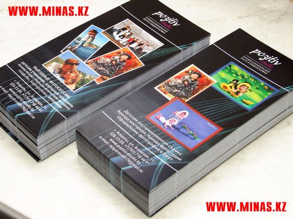 --------------------------------------------- Задачи решаемые компанией «МИНАС принт» включают в себя: * Визитные карточки * Тиражирование материалов заказчика * Специализированная бланочная продукция, фирменные бланки * Пригласительные, открытки * Прайс-листы, каталоги * Рекламные листовки, флаеры, лифлеты * Брошюры, буклеты, проспекты * Грамоты, подарочные сертификаты * Сувенирные магниты, магнитные визитки * Сувенирные кружки, тарелки, блюдца * Домовые знаки * Фотокартины * Пленочную термоаппликацию и сублимацию И многое другое… Республика Казахстан г. Алматы Наурызбай батыра 58 (уг. ул. Гоголя) оф.,, minas-print@mail.ru