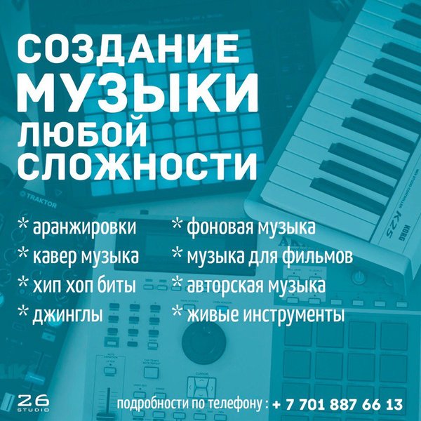 ригинал! Или вы снимаете фильм и вам очень сильно нужна по настоящему крутая музыка для вашей картины? Мы с радостью напишем фантастическую музыку для Вас! ••••••••••••••••••••••••••••••••••••••••••••••••• Мы имеет огромный опыт в создании музыки! Мы работали над созданием композиций для многих казахстанских звезд и исполнителей российского шоу бизнеса! Занимались созданием музыки для многих фильмов и конечно же не один раз выручали наших клиентов с этой услугой! ••••••••••••••••••••••••••••••••••••••••••••••••• По всем вопросам в Дайрект либо по номеру •••••••••••••••••••••••••••••••••••••••••••••••••