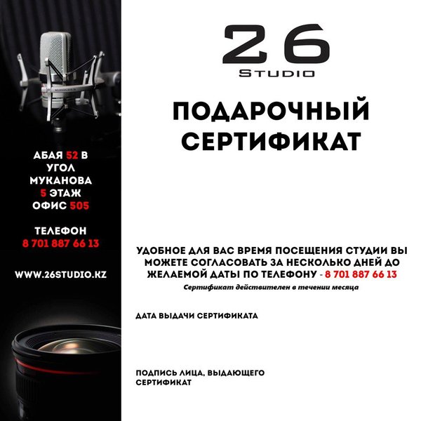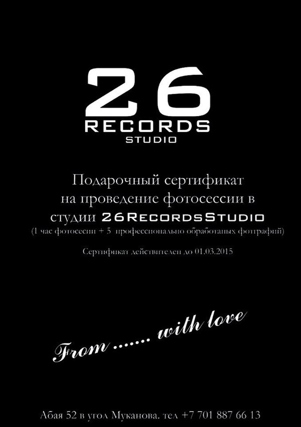 Не знаете что подарить любимому человеку на 14 февраля??? Мы уже придумали за Вас! Медиа студия 26RecordsStudio предоставляет подарочные сертификаты на День Всех Влюбленных! Сертификат на запись песни (запись, обработка голоса, сведение, мастеринг) - 9.999 тг и Сертификат на фотосессию (1 час на фотостудии с фотографом + 5 профессионально обработанных фотографий) - 12.999 тг. Спешите! Количество сертификатов ограниченно!!!! Всем хорошего настроения!) Заказывайте по телефону