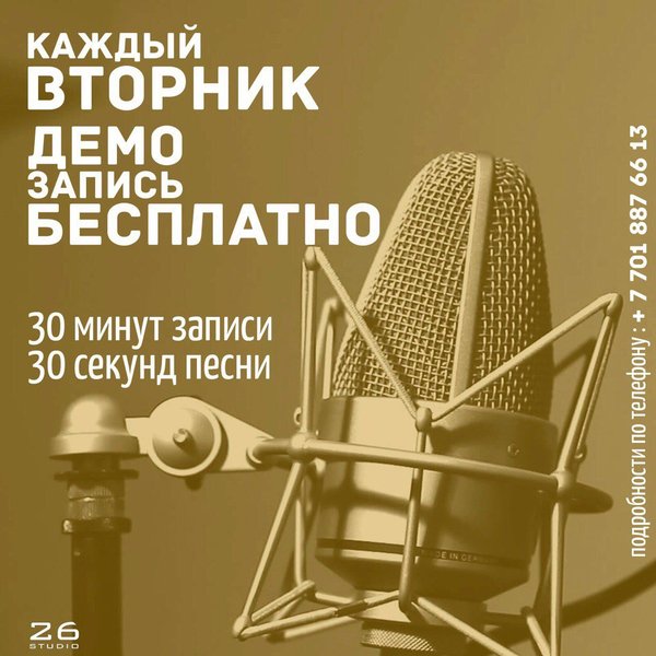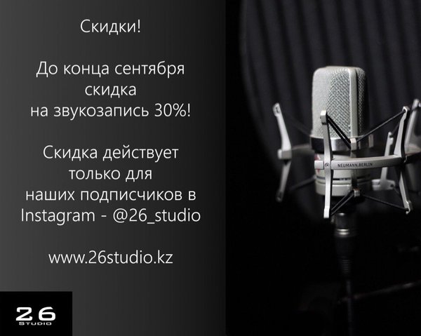 Здравствуйте! Медиа студия 26Studio дарит вам крутую акцию! Запиши песню до конца сентября с 30% скидкой!!! Бронирование времени по телефону.