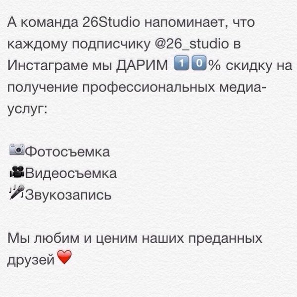 Всем привет! Все дружно подписываемся на страничку студии в Instagram! Каждому подписчику, скидка 10%!!!!!! @26recordsstudio @26recordsstudio @26recordsstudio