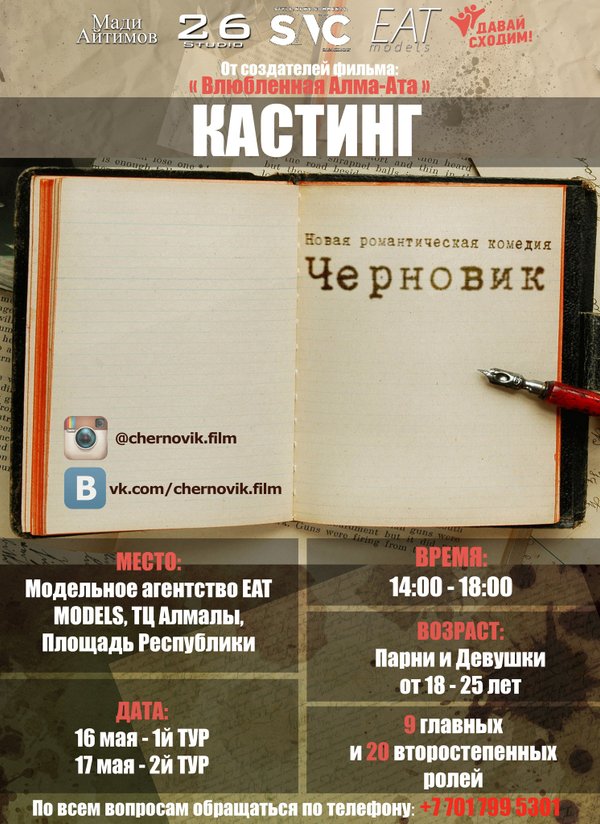 ФИЛЬМ: ЧЕРНОВИК (Алматы, Казахстан) (11.06.2015): ФИЛЬМ: ЧЕРНОВИК 10.06.15 После серии мастер классов и работы над собой, актеры делают большие успехи. Ну а мы, продолжим следить за их ростом.