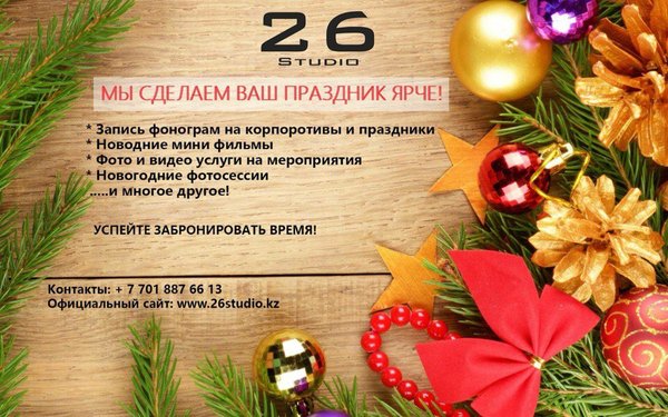 Скоро Новый год!!! Начни готовится к мероприятиям заранее! Корпоратив а не знаешь чем порадовать и удивить коллег? Хочешь сохранить яркие моменты в фото или видео? Или может быть ты ставишь сценку и тебе нужна помощь по озвучке? Все это и многое другое только у нас! P.S. Декабрь самый загруженный месяц в году, так что лучше бронируйте время заране!) С уважением, 26Studio