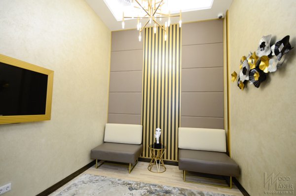 Такая красивая зона ожидания Стена обтянута экокожей, деревянные рейки с патиной, журнальный столик и мебель нашего исполнения ️ ‼️Мягкую мебель мы не изготовляем, так как специализируемся больше на дереве, но если заказчику удобнее доверить весь проект нам, то мы выполним его желание, конечно все зависит от объёма При изготовлении использовались следующие материалы: Панель: МДФ, поролон, экокожа. Рейки: МДФ, патина, лакокрасочные производство Италия. Столик: металл, патина, Стекло. Спешите отправить свой проект для расчета! Наш адрес г.… — Читать дальше