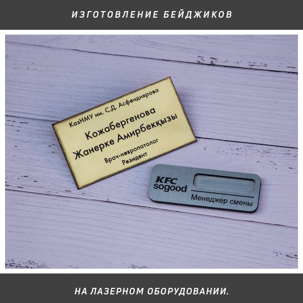 Изготовление бейджиков на лазерном оборудовании. Бейджи изготавливаются из двуслойных пластиков Rowmark, имеющих металлизированную поверхность и фактуру. Есть цвета «золото», «серебро», «бронза». Крепление бейджей — булавка или магнит на выбор. ________________________________________ Наши Контакты: dbstudiokz@mail.ru ________________________________________