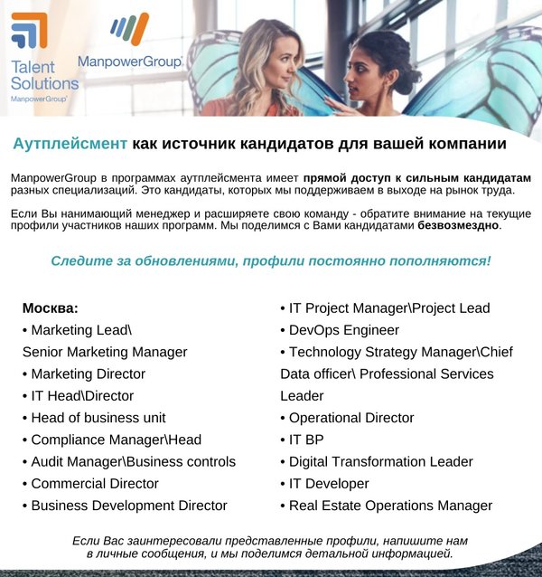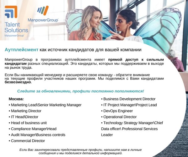 Что такое #Аутплейсмент в ManpowerGroup? Это программы, направленные на успешное трудоустройство уволенных сотрудников. ManpowerGroup имеет большую базу сильных участников программы аутплейсмента, которыми мы готовы поделиться с вами. Обращайтесь, если вас заинтересовал профиль кандидата, и мы поделимся детальной информацией!