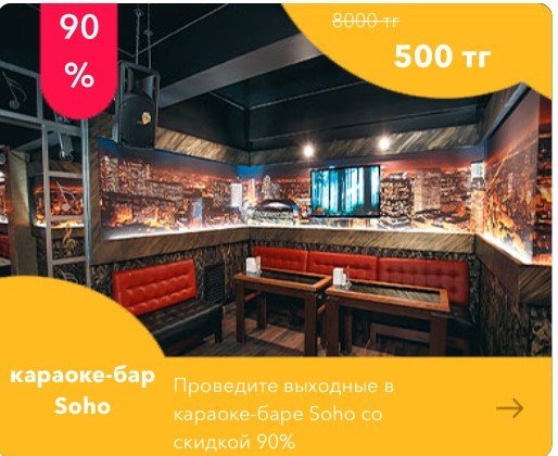 С карточкой EasyGo вы можете посетить удивительный караоке бар «Soho» Очень уютная обстановка, внимательные официанты, вкусная еда а, главное караоке огонь со скидкой 90%