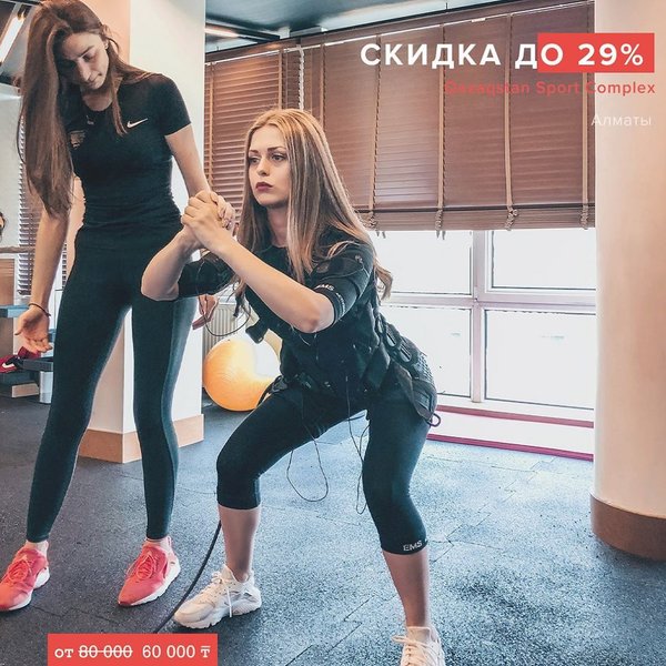 отипные тренировки. Стоит попробовать, тем более со скидками до 29% в «Qazaqstan Sport Complex». • 1 месяц посещения EMS-тренировок – 60 000 тенге вместо 80 000 тенге • 3 месяца посещения EMS-тренировок – 110 000 тенге вместо 150 000 тенге • 6 месяцев посещения EMS-тренировок – 215 000 тенге вместо 300 000 тенге • 12 месяцев посещения EMS-тренировок – 355 000 тенге вместо 500 000 тенге «Qazaqstan Sport Complex» ждёт Вас! Ссылка: