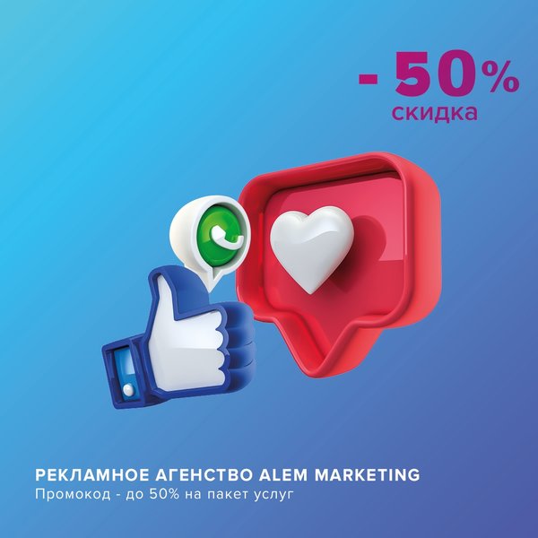 жете получить совершенно бесплатно! Также они предлагают скидку 20% на таргетированную рекламу и скидку 50% на пакет маркетинговых услуг SMM. За небольшую в этой сфере сумму Вы получите анализ клиентской аудитории, настройку рекламы и определение подходящего возраста клиента. Иди наравне со временем вместе с «ALEM Marketing»! Ссылка: _маркетинг маркетинг