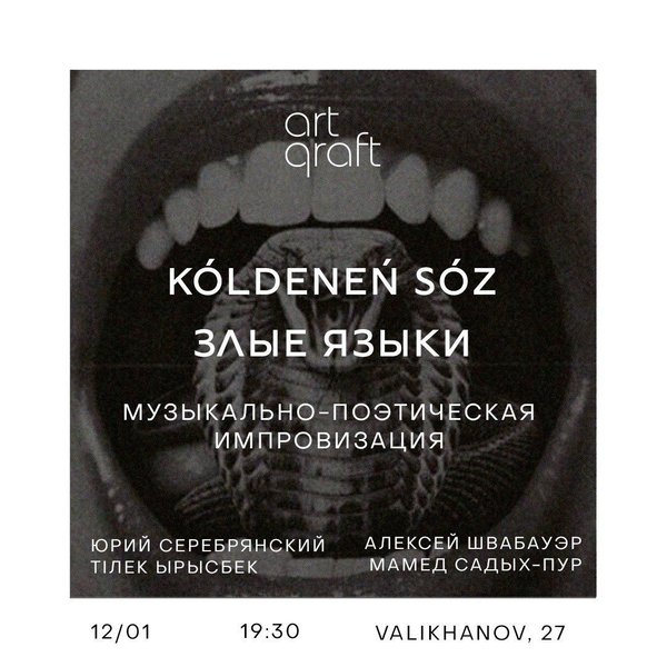 Злые языки / Көлденең сөз (05.01.2019): Музыкально-поэтическая импровизация / Музыкалды-поэтикалық импровизация Юрий Серебрянский/Тiлек Ырысбек/Алексей Швабауэр/ Мамед Садых-Пур Русский/Қазақша/Музыка 12 января ARTQRAFT Начало в 19:30 Вход: 1000 тг.