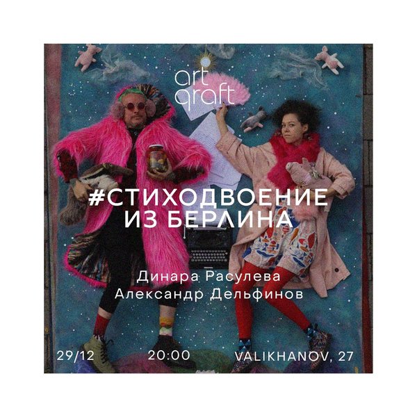 были выступления в разных городах Европы, Нью-Йорке, Токио, Тель-Авиве и Иерусалиме. Экспериментальный авторский стиль включает совместное написание текстов, современный поэтический перформанс и спектр тем от гендерных стереотипов до пронизывающего нашу жизнь насилия. ARTQRAFT (г. Алматы, ул. Валиханова, 27) Суббота, 29 декабря Начало: 20:00 Вход свободный #bipoetry — be poetry!