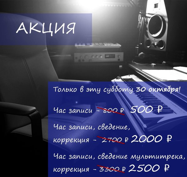 В эту субботу 30 октября МЕГА-СКИДКИ на запись, сведение и коррекцию вокала! Успейте записаться через сообщения в наших соц. сетях или по т.