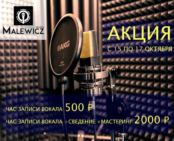 С пятницы по воскресенье (15—17 октября) у нас предстоит горячая пора! Мы проводим двойную акцию Условия проведения: Стоимость часа записи 500 р. Час записи вокала, сведение и мастеринг 2000 р. Всё что вам нужно для этого: заранее записаться на время сообщив, что вы по акции; приехать и записать песню; отметить нас в своей истории Инстаграм или разместить пост в ВК с нашей отметкой @malewiczrec Запись через сообщения в ВК Или по телефону