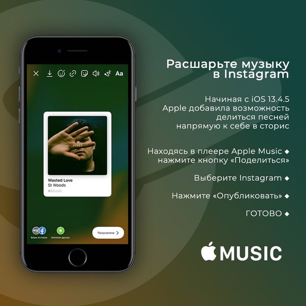 Хорошие новости от Apple. Будет полезно всем музыкантам! Начиная с iOS 13.4.5 Apple добавила возможность делиться музыкой со своими подписчиками в истории Instagram. После публикации песни в Instagram, ваши подписчики смогут тапнуть на картинку и послушать трек в «Apple Music». Таким же способом можно расшарить трек и в Facebook. P. S. По поводу размещения песен на цифровых площадках пишите нам в ЛС.