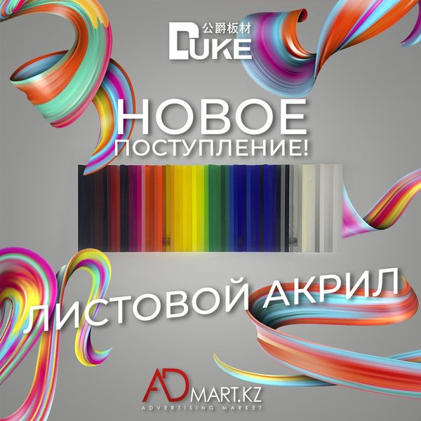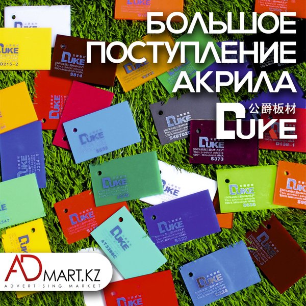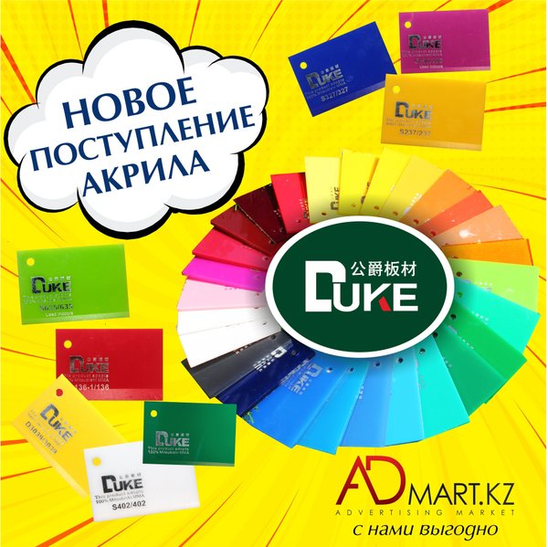 Новое поступление качественного листового акрила фирмы DUKE! Обладает рядом преимуществ, обеспечивающих лучший результат в изготовлении рекламных конструкций из акрила: — Высокое качество; — Долговечность цвета; — Устойчивость ко внешним факторам воздействия; — Отличные формовочные свойства.