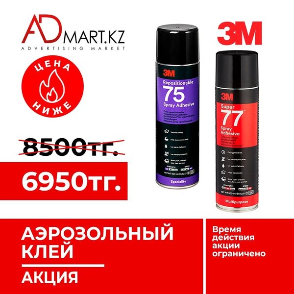 Выгодное предложение! Универсальный клей-спрей 3М™️: ⠀⠀ • Низкий расход — покрывает 13 кв.м; • Склеивает большинство лёгких материалов; • Не просачивается, не оставляет пятен, не деформирует бумагу; • Ровная линия склеивания; • Удобен в работе. ⠀ Доставляем бесплатно по г.Алматы. ⠀ Есть вопросы? — обратитесь к нашим менеджерам или перейдите на сайт — Admart.kz