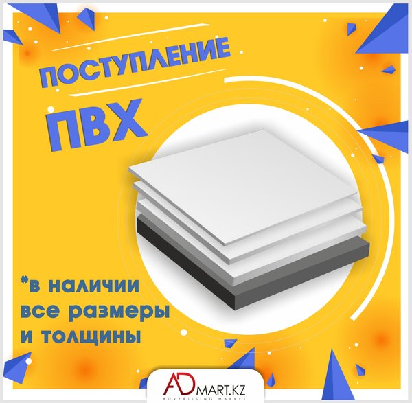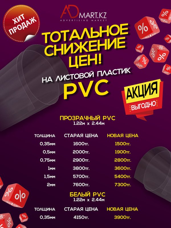 Радуем вас хорошими новостями с приходом тепла! В магазине ADmart.kz большое поступление пластика PVC и PET: — Прозрачный PVC — АНТИБЛИК — РЕТ листы — Белый PVC (двухсторонний) — Черный PVC (двухсторонний) Чтобы получить подробную информацию о товарах, свяжитесь с нашими менеджерами. ⠀⠀ БЕСПЛАТНО осуществляем доставку по г. Алматы.