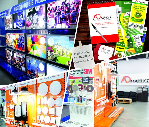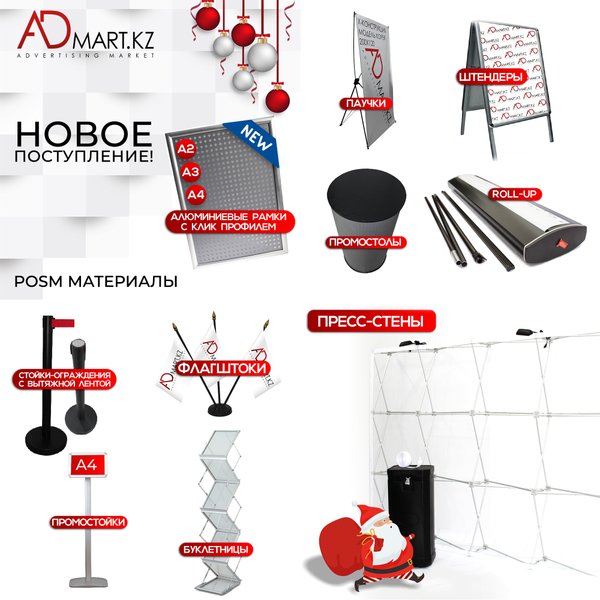 Большое поступление POSM материалов и рекламного оборудования! • Флагштоки • Паучки • ROLL UP • Промостолы • Буклетницы • Промостойки • Рамки для баннеров • Штендеры и мольберты • Стойки-ограждения с вытяжной лентой • Алюминиевые рамки с клик-профилем и многое другое. Подробную информацию о товарах вы можете уточнить у наших менеджеров или на сайте Admart.kz БЕСПЛАТНАЯ доставка по г. Алматы. ⠀ Адреса магазинов: Сатпаева, 90/34 переул. Казыбаева, 61а ⠀ Телефоны: +7 (727) 312‒38‒88 +7 (727) 317‒28‒88 +7‒707‒399‒88‒88 +7‒700‒399‒88‒88