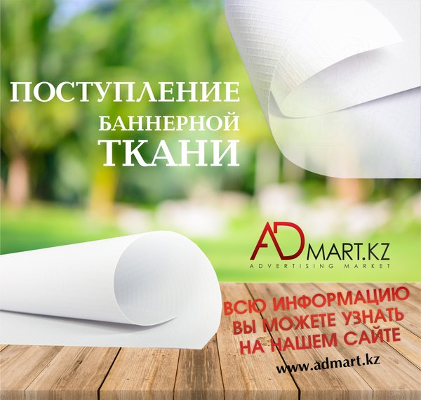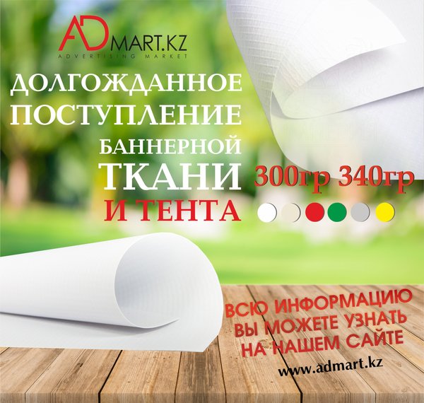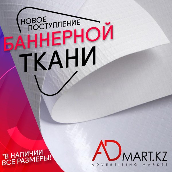 Приветствуем Вас, дорогие наши! Новое поступление баннерной ткани Весь ассортимент в наличии Спешите приобрести настоящий хит продаж по самым выгодным ценам Подробную информацию Вы можете найти в нашем интернет-магазине : или уточнить у наших специалистов. Напоминаем, что каждый покупатель может воспользоваться бесплатной доставкой по г.Алматы Ждем Вас по адресу : ADMART Сатпаева, 90/34 +7 (727) 312‒38‒88 +7 (727) 317‒28‒88 +7‒707‒399‒88‒88 +7‒700‒399‒88‒88 Желаем отличного дня и прекрасного настроения! Искренне Ваш, Admart.kz