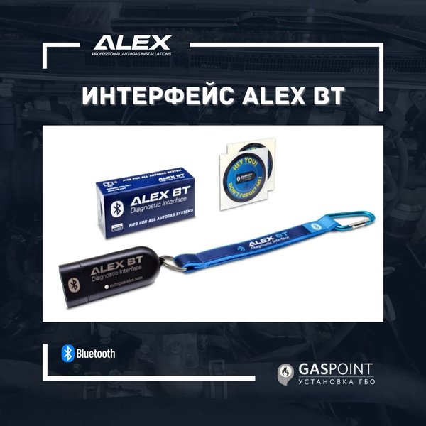 ость выбора установки другого производителя или запрограммировать скорость передачи в соответствии с вашими потребностями. Чтобы расширить список обслуживаемых установок к стандартному 4-контактному разъему необходимо подключить адаптер/комплект адаптеров (переходников). ________________________ Комплект включает: • интерфейс ALEX BT со звуковой сигнализацией • ремешок ALEX BT • 2х наклейка для ноутбука • инструкция по эксплуатации Установки, обслуживаемые без адаптеров – ALEX OPTIMA/IDEA – AC STAG 200 / STAG 300 / STAG 300 PLUS / STAG 300 PREMIUM / STAG 4 / ISA2/ ISA3 / STAG DPI / STAG XL / STAG GO FAST / STAG Q-BOX / STAG Q-MAX / STAG Q-NEXT – AGIS ML210 / P13 – ATIKER FAST / MULTI FAST / SAFE FAST – CARGAS SOLARIS – DIGITRONIC DGI / EASY FAST – ESGI / ESGI 2 – EUROPEGAS VECTOR 4/6/8 – IC 4-GAS – KME (после апреля 2009) AKME / BINGO / BINGO M / BINGO S / DIEGO / DIEGO-G3 / NEVO – LOVATO FAST / SMART / EASY – LPGTECH (все модели контроллеров) – LOGOGAS – LS NEXT – PALCAR OBD – POLETRON 26 / 1,26 / 2,26 / 3 – TAMONA TG-STREAM NEW – TEGAS TE-SL / TE-PS / TE-PM / TE-STREAM / TE-STREAM-OBD – WENTGAS – VECTOR – 4GAS Установки, обслуживаемые адаптерами ALEX BY AEB – производные AEB – другие типы установки ______________________ Рабочее напряжение питания 8 ~ 16V DC Ток питания 50 ~ 200mA DC Класс мощности передачи класс 1 (диапазон до 100м) Рабочая температура –20°C ~ +75°C Класс герметичности IP40 Разъем 4-контактный разъем Super Seal, «папа» Установите ГБО премиального качества в Алматы в АСЦ Gas Point. Gas Point ⠀ Алматы, ул. Розыбакиева 238а ⠀ Whatsap) ⠀