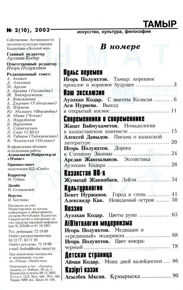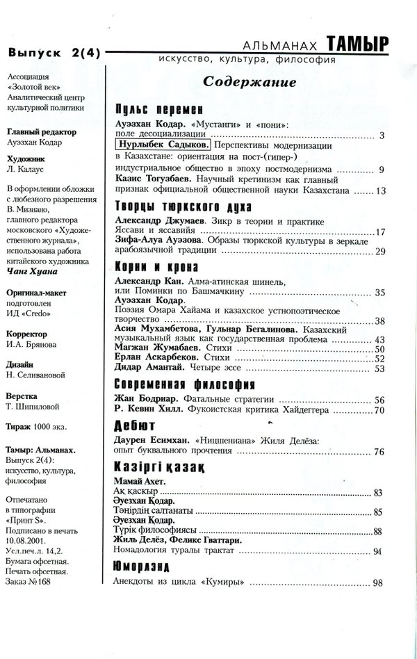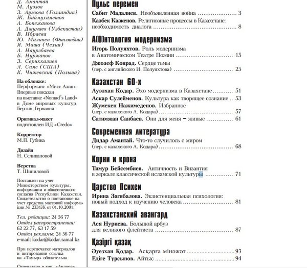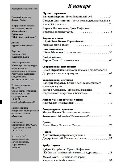 Номер 6, здесь хочется обратить внимание на статью Валерии Ибраевой о современном искусстве, поэзию Ларри Симса из американского ПЕН-Клуба, на статью Юрия Зуева и Кенже Торланбаевой о тюркском манихействе, интервью писателя Юкки Малинена о казахских интеллектуалах новой волны.6 номер. Скачивайте, читайте, берите нужные материалы, ссылайтесь, обсуждайте, пишите статьи и отзывы.