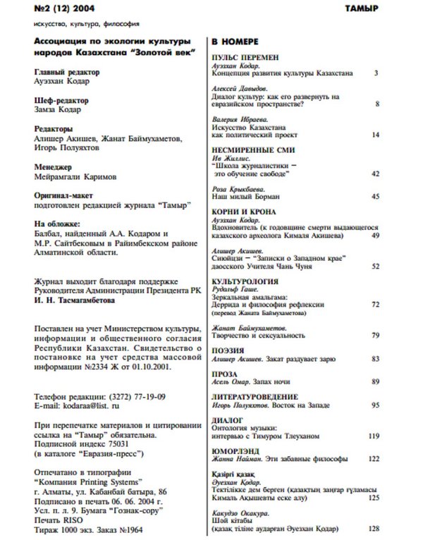 т «Записки даосского князя Чань-Чуня» под редакцией и в переводе А. Акишева. Известно, что Чинисхан последние годы своей жизни озаботился вопросом о бессмертии и призвал к себе китайского даоса Чань-Чуня, который оставил свои бесценные записи, приведенные нами в журнале. Кроме того в разделе «Қазіргі Қазақ» следует отметить «Книгу чая» Какудзо Окакура в переводе А. Кодара. Это совершенно уникальный трактат по дзен-буддизму в Японии и о таинствах чайной церемонии. Этот номер окрашен в печальные тона, так как посвящен годовщине смерти выдающегося археолога Кемаля Акишева (статья «Вдохновитель» А. Кодара написана с большим почтением ко всем свершениям известного ученого). На обложке величаво красуется балбал, найденный А. Кодаром и М. Саитбековым в Райымбекском районе Алматинской области.