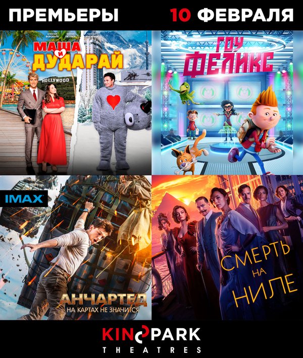 Премьеры в Kinopark Что смотреть с сегодняшнего дня на наших экранах: «Маша и Дударай» (ромком, 6+) «Анчартед: На картах не значится», также в IMAX (боевик, приключения, 12+) «Смерть на Ниле» (триллер, криминал, 16+) «Гоу, Феликс» (мультфильм, приключения, семейный, 6+) Выбирайте фильм, удобный сеанс на kinopark.kz, и до встречи в кино