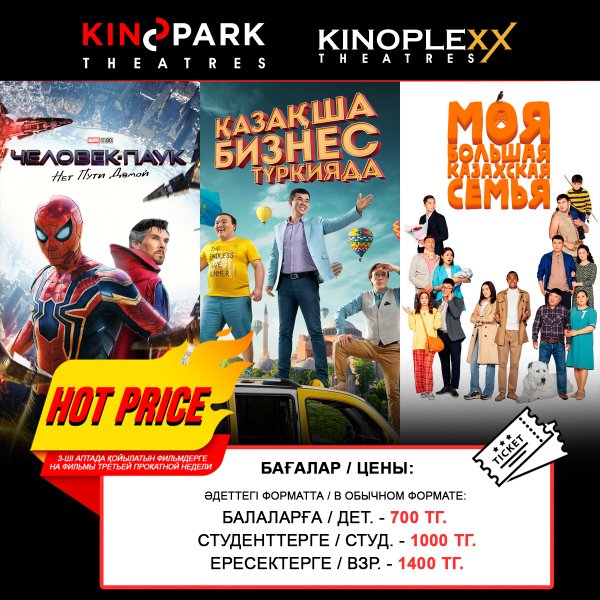 Hot Price в Kinopark! Друзья, на фильмы «Моя большая казахская семья», «Человек-Паук: Нет пути домой» и «Бизнес по-казахски в Турции» действуют специальные цены Hot Price! А это значит, что стоимость билетов составляет: 700 тг. Детский тариф 1000 тг. Студенческий тариф 1400 тг. Взрослый тариф В залы IMAX: 1000 тг. Детский тариф 1500 тг. Студенческий тариф 2000 тг. Взрослый тариф Сеансы фильма «Человек-Паук: Нет пути домой» в формате IMAX доступны в кинотеатрах Kinopark 8 IMAX Saryarqa и Kinopark 7 IMAX Keruen. А ещё, не забывайте, чт… — Читать дальше