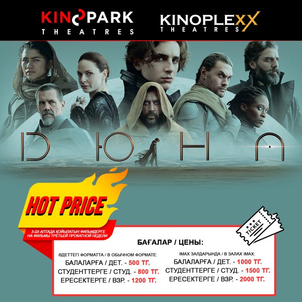 HOT PRICE Друзья, в наших кинотеатрах действуют специальные цены Hot Price на фильмы «Дюна» и «Шан-Чи и легенда десяти колец»! В обычных залах: 500 тг. — детский билет 800 тг. — студенческий билет 1200 тг. — взрослый билет В залах IMAX: 1000 тг. — детский билет 1500 тг. — студенческий билет 2000 т. — взрослый билет До встречи в кино!